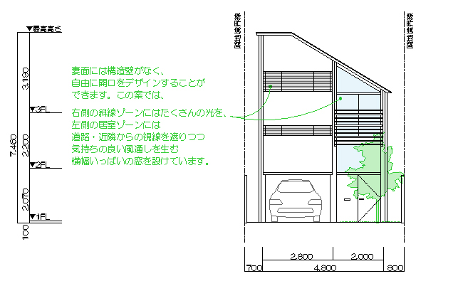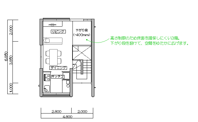 狭小地はそれぞれ個性がつよく、また設計条件も案件によってさまざまなので、「背の低い3階建て」には固定的な間取りはありません。